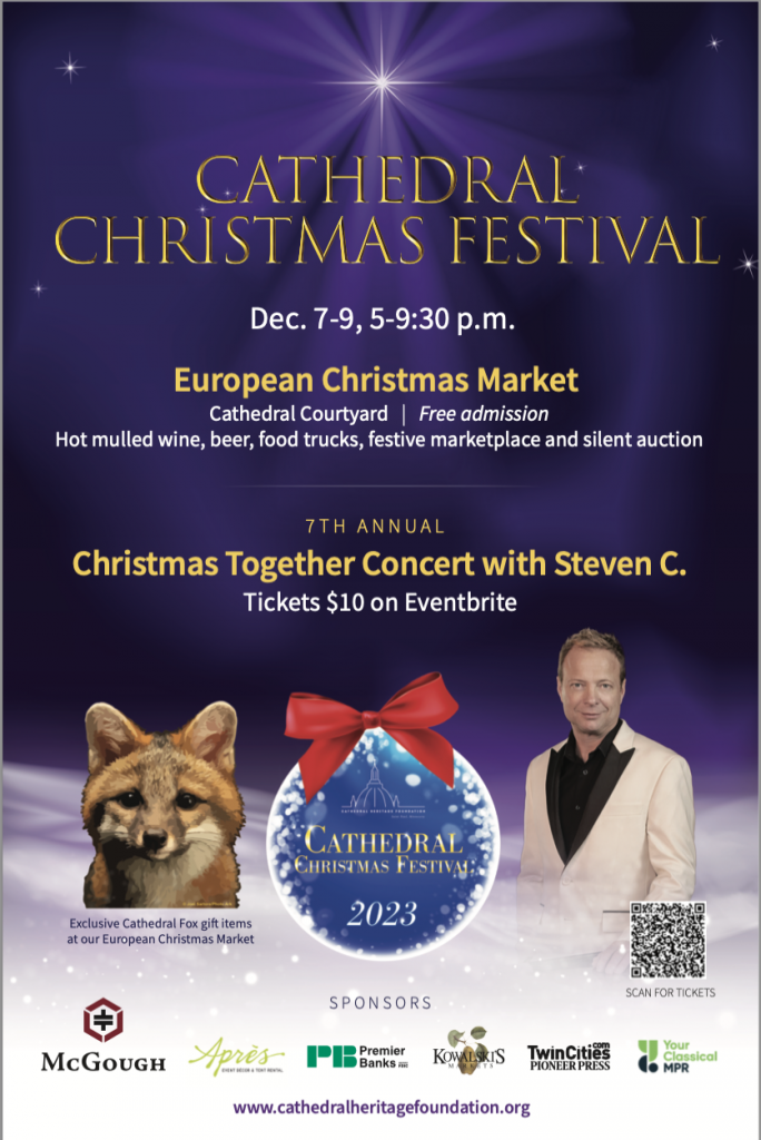 Multi-platinum recording composer and pianist Steven C will bring his popular Christmas Together concerts inside the Cathedral to be part of the festival at 7 p.m. on both Thursday, December 7, and Friday, December 8. Tickets will be $10 and sold on Eventbrite and at the door. On Saturday, December 9, the University of Mary from Bismark, North Dakota, will perform a choral concert, along with area high school choirs lending their voices. Proceeds from the Christmas Market and Christmas Together with Steven C concerts will go towards ongoing Cathedral restoration and preservation projects.